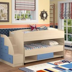 Кровать-чердак "Дюймовочка-4/3" рассчитана на двоих детей, так как объединяет два полноценных спальных места. Выдвижная нижняя кровать может устанавливаться в удобном положении для сна в ночное время и убираться в дневное время. Под кроватью имеется ящик для белья и открытые ниши. В лестнице предусмотрены выдвижные ящики для хранения вещей. Такой уголок экономит пространство в детской комнате. Кровать подойдет детям от 2 до 18 лет.